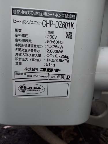 三木市大村 コロナ自然冷媒CO2家庭用ヒートポンプ給湯機ヒートポンプユニットCHP-DZ601K エコキュート交換工事|兵庫県のエコキュート専門交換工事店|兵庫エコキュート交換ショップ補助金対応可能