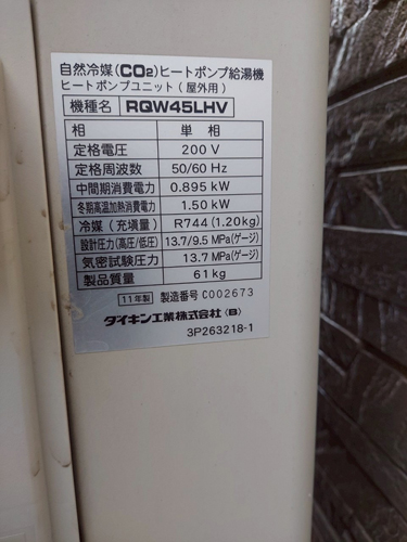 尼崎市昭和通 ダイキン自然冷媒CO2ヒートポンプ給湯機ヒートポンプユニットRQW45LHV→コロナ自然冷媒CO2家庭用ヒートポンプ給湯機貯湯ユニットCTU-37AZ1K、ヒートポンプユニットCHP-DZ451K エコキュート交換工事