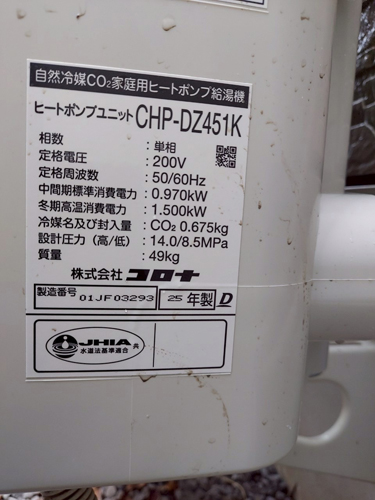 トップページ > 工事事例一覧 > 尼崎市昭和通 コロナ自然冷媒CO2家庭用ヒートポンプ給湯機貯湯ユニットCTU-37AZ1K、ヒートポンプユニットCHP-DZ451K エコキュート交換工事