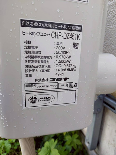 明石市本町 コロナ自然冷媒CO2家庭用ヒートポンプ給湯機ヒートポンプユニットCHP-DZ451K エコキュート交換工事